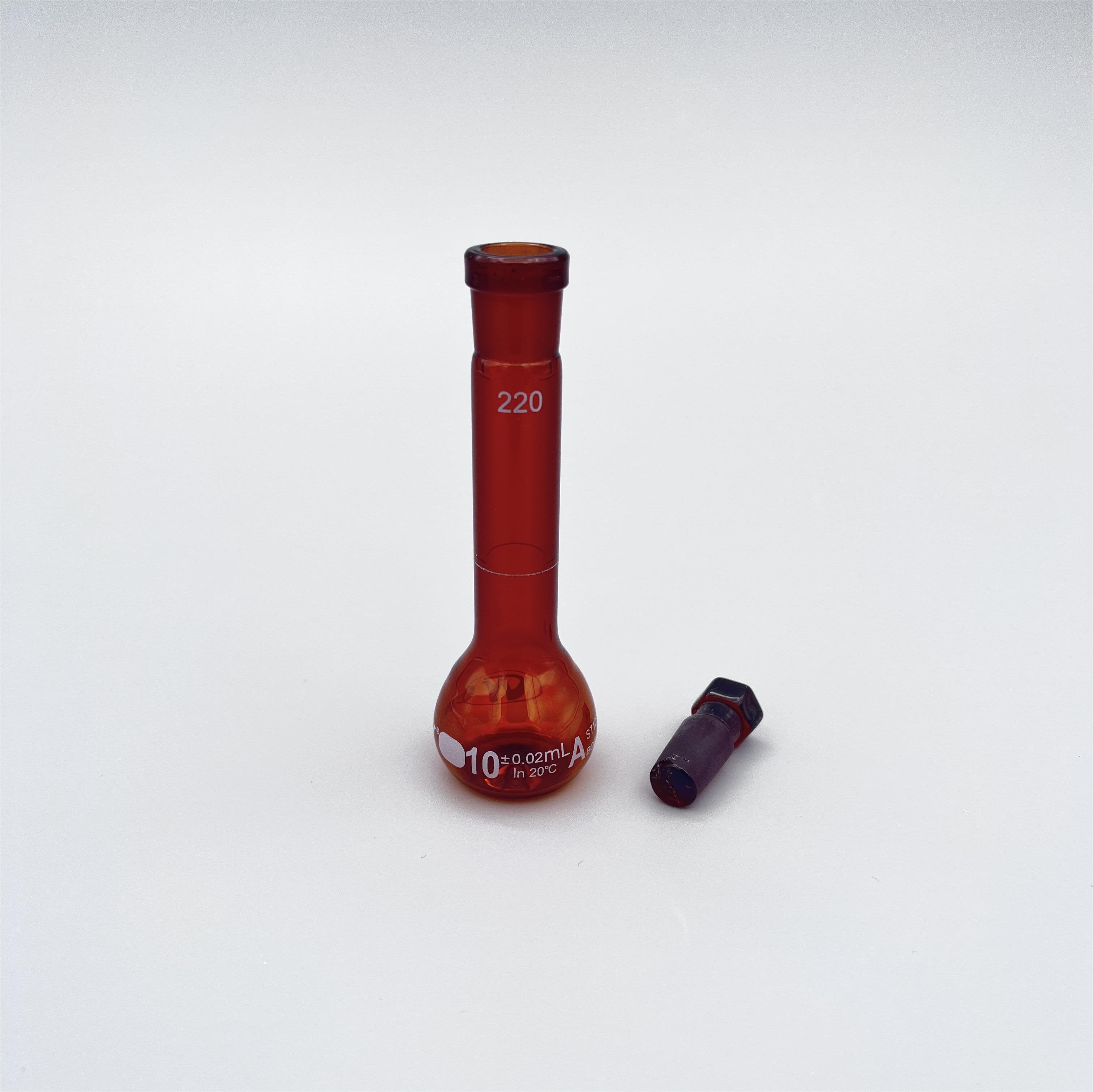 Volunmetric flask, 10 mL,±0.02, class A, amber, ST 10/13, with ST glass stopper, white graduated, made from borosilicate glass 3.3